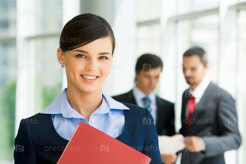 Портрет уверенной женщины, глядящей в камеру со своими коллегами на заднем плане