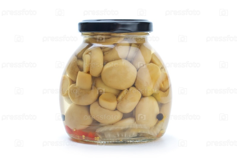 Стеклянная банка с маринованными шампиньонами на белом фоне