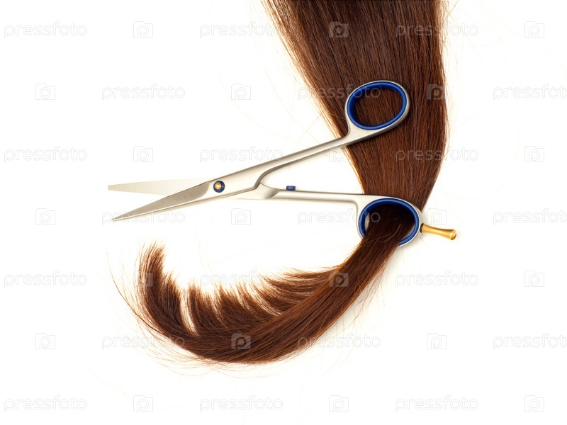 Ножницы и локоть волос изолированы на белом фоне