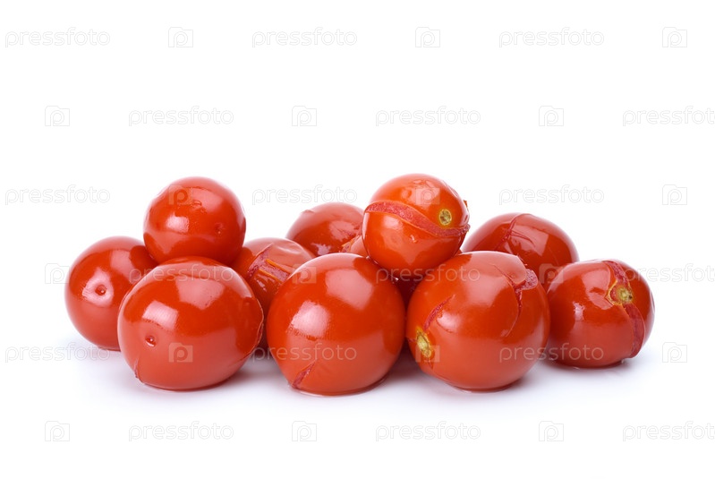 Несколько маринованных помидоров черри на белом фоне