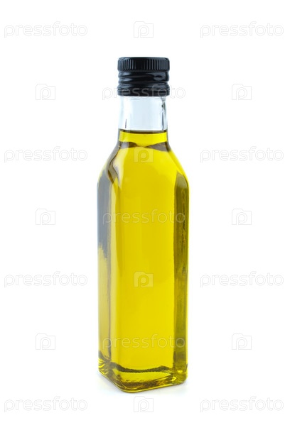 Стеклянная бутылка с оливковым (подсолнечным или кукурузным) маслом, на белом фоне
