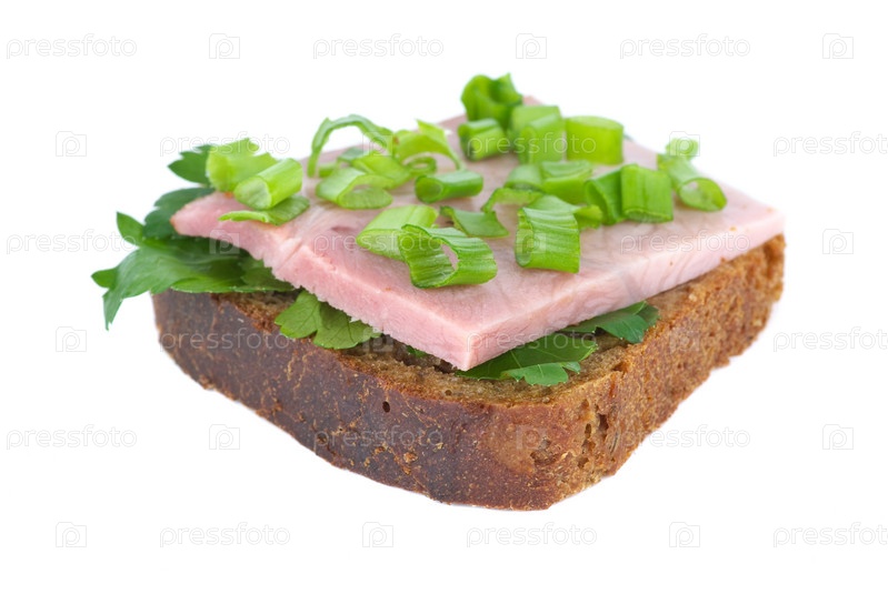 Бутерброд с ветчиной, ржаным хлебом и зеленью на белом фоне