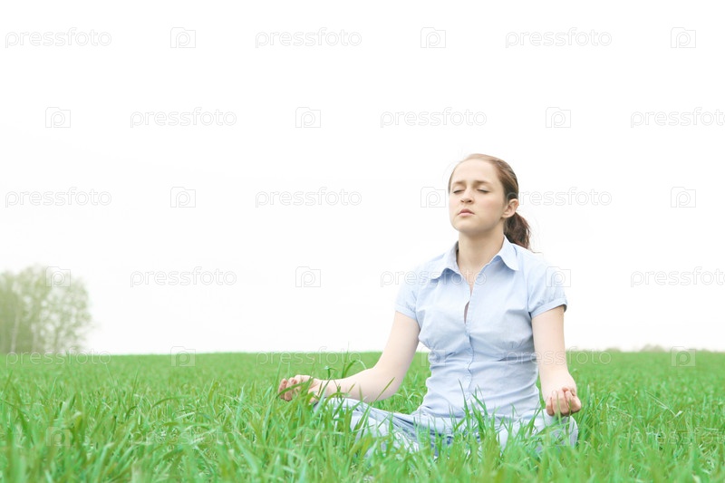 Молодая женщина медитирует, сидя на зеленой траве на поле