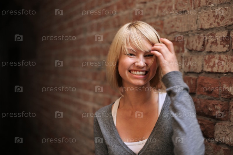 Улыбающаяся блондинка на фоне кирпичной стены