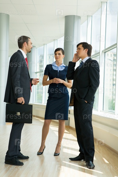 Уверенные деловые партнеры стоят в офисном здании и обсуждают работу