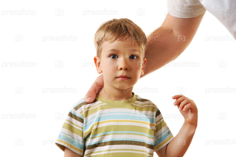 Маленький ребенок с отцовской рукой на плече