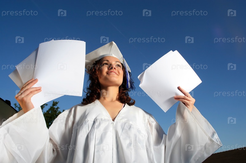 Счастливая молодая девушка в костюме выпускника с чистыми листами бумаги в руках на фоне голубого неба