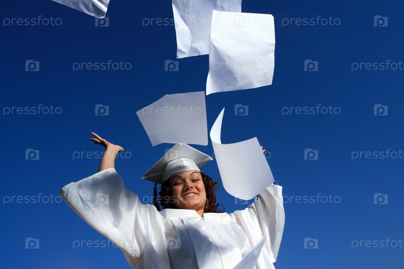 Счастливая молодая девушка в костюме выпускника, кидающая листы бумаги в синее небо
