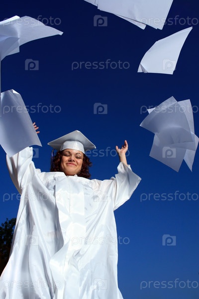 Счастливая молодая девушка в костюме выпускника, кидающая листы бумаги в синее небо