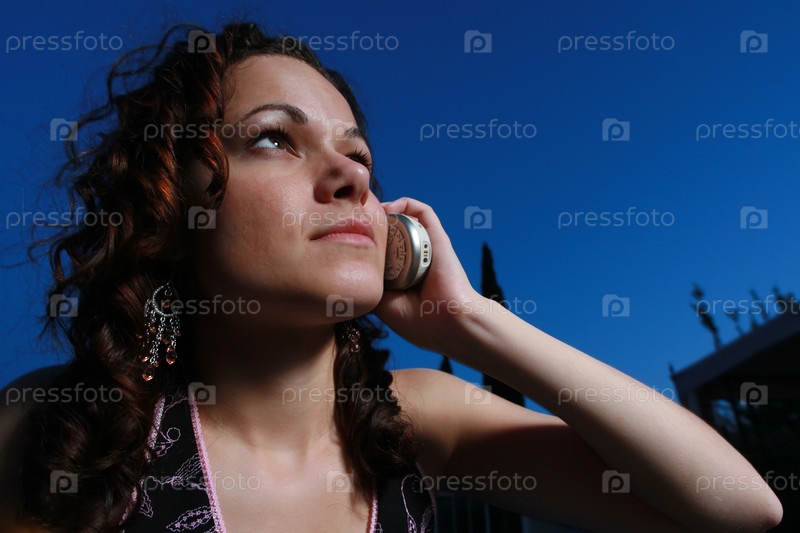 Портрет молодой девушки с сотовым телефоном в руке на фоне синего неба