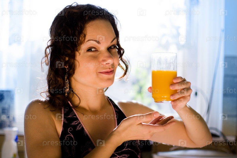 Портрет молодой девушки с бокалом апельсинового сока