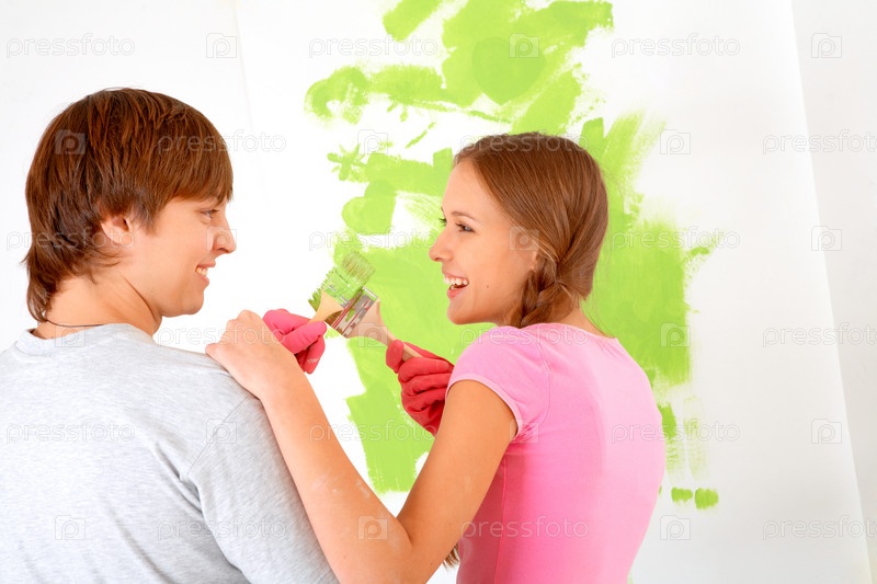Счастливые девушка и юноша красят стену в квартире