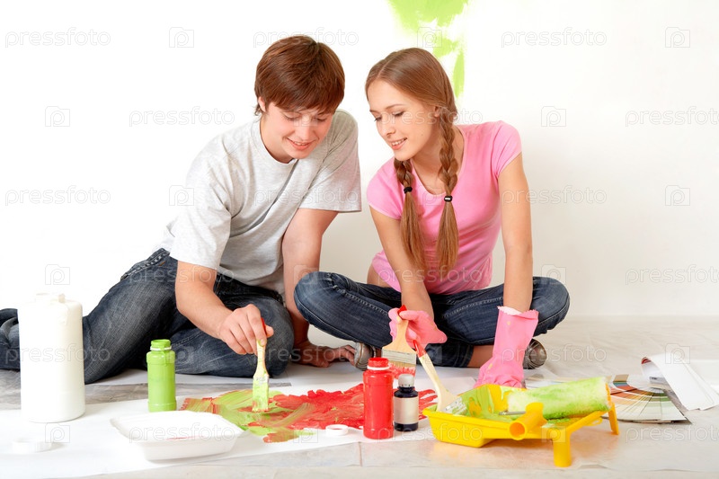 Юноша и девушка смешивают краски для ремонта в квартире