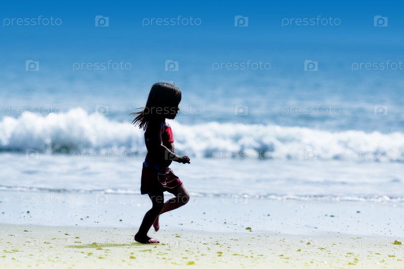 Маленькая девочка бежит по берегу океана