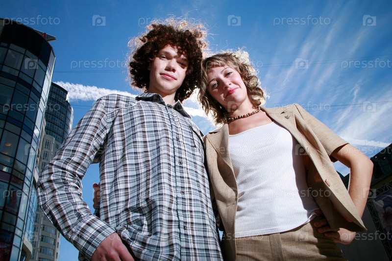 Портрет кудрявого юноши и молодой женщины на городской улице