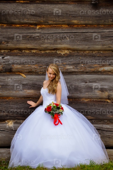 Невеста с букетом у бревенчатой стены