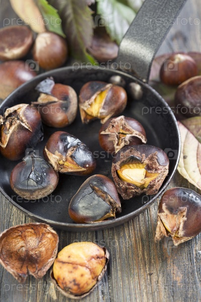 Сковорода с жареными каштанами крупным планом