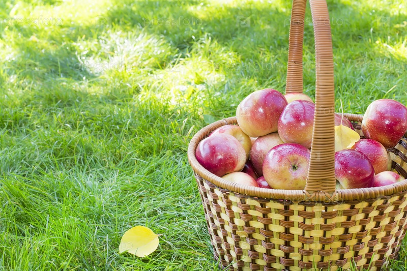 Красные яблоки в корзине в саду