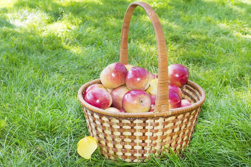 Красные яблоки в корзине в саду