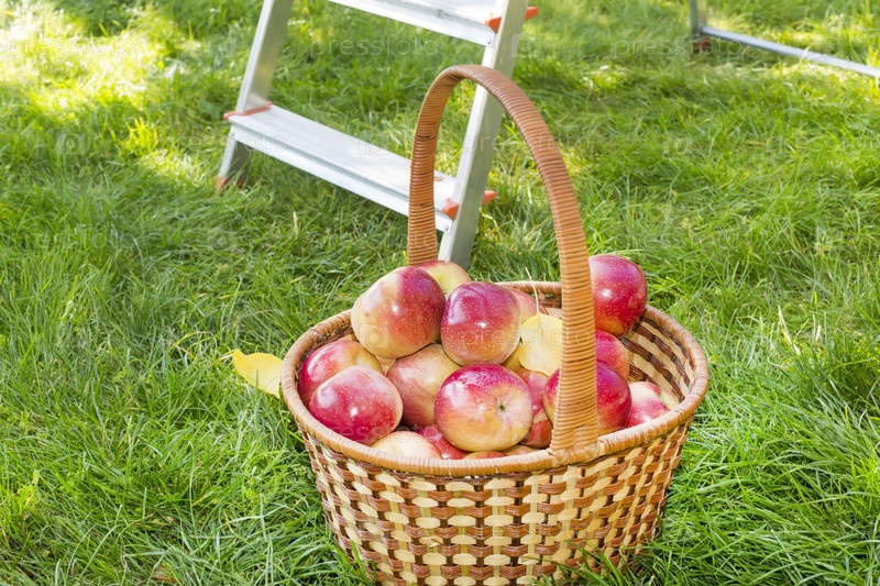 Красные яблоки в корзине в саду