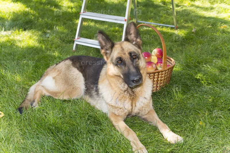 Собака охраняет яблоки в саду