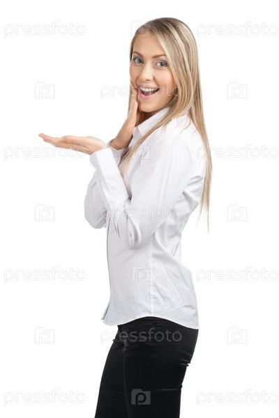 Удивленная деловая женщина показывает что-то на ладони