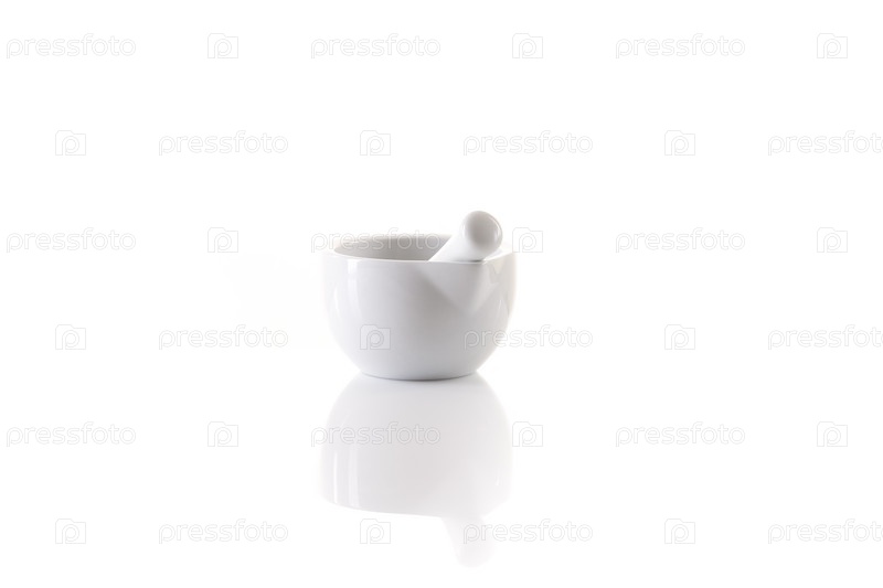 Белая ступка и пестик на белом фоне