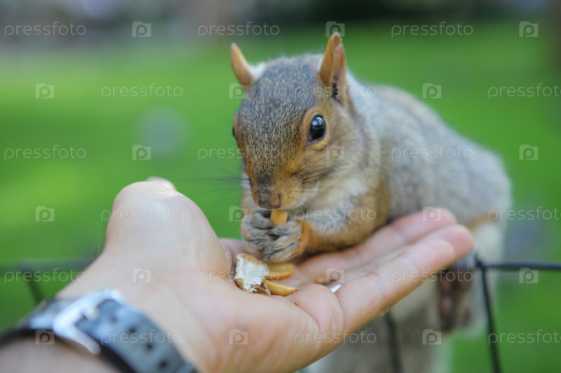 Любопытная белка с орехом в Центральном парке, Нью-Йорк