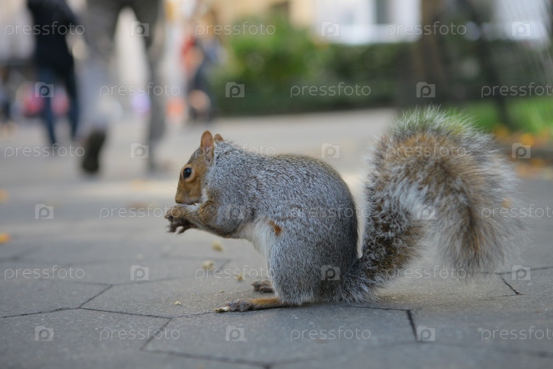 Любопытная белка с орехом в Центральном парке, Нью-Йорк