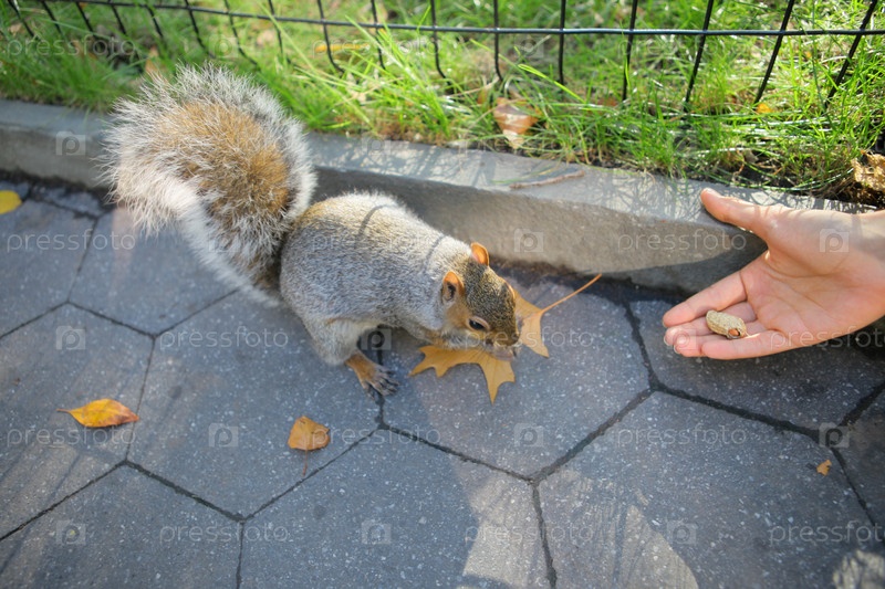 Любопытная белка с орехом в Центральном парке, Нью-Йорк