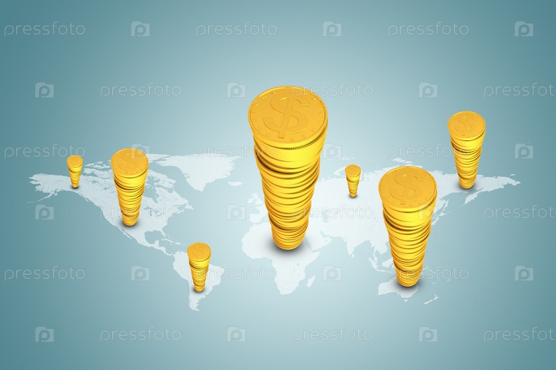 Стопка золотых долларов и карта мира