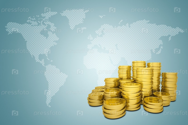 Стопка золотых долларов и карта мира