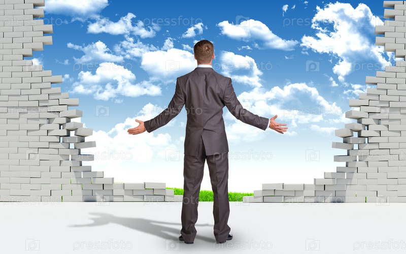 Бизнесмен у разрушенной кирпичной стены
