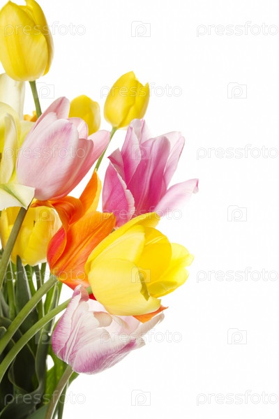 Букет разноцветных тюльпанов на белом фоне
