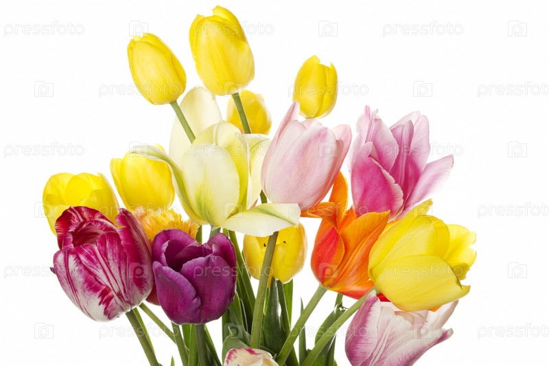 Букет разноцветных тюльпанов на белом фоне