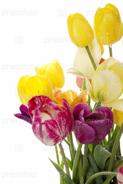 Букет разноцветных тюльпанов на белом фоне