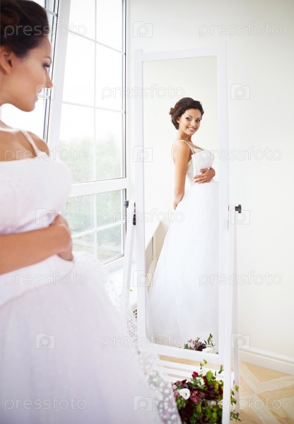 Молодая красивая невеста меряет платье