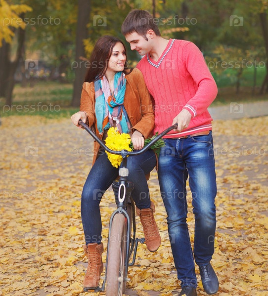 Счастливая пара с велосипедами в осеннем парке