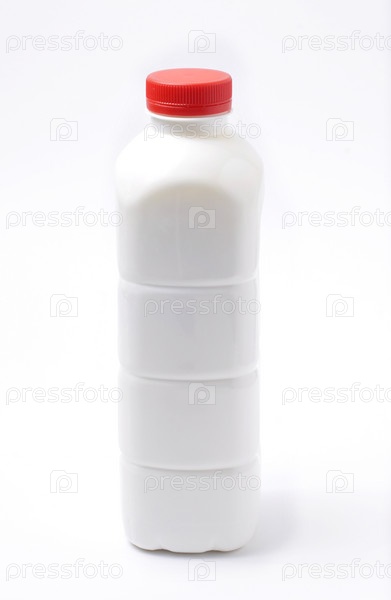 Белая бутылка с красной крышкой на белом фоне