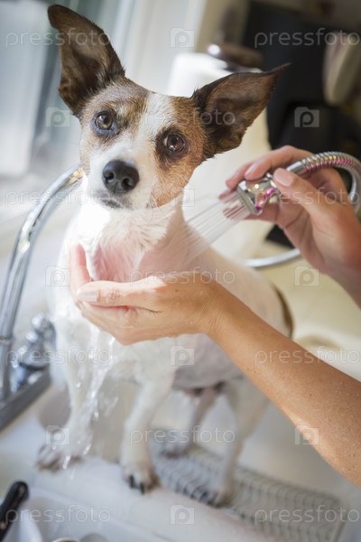 Собаку породы джек-рассел терьер моют в раковине