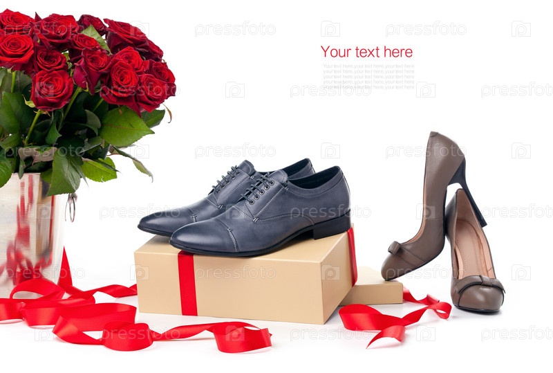 Обувь и букет роз на белом фоне