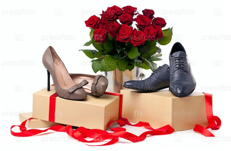 Обувь и букет роз на белом фоне