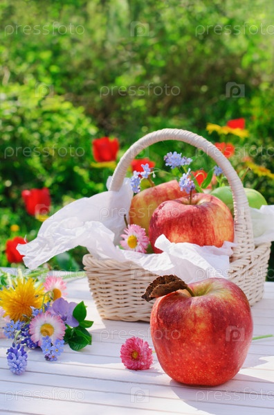 Летний натюрморт с яблоками и цветами