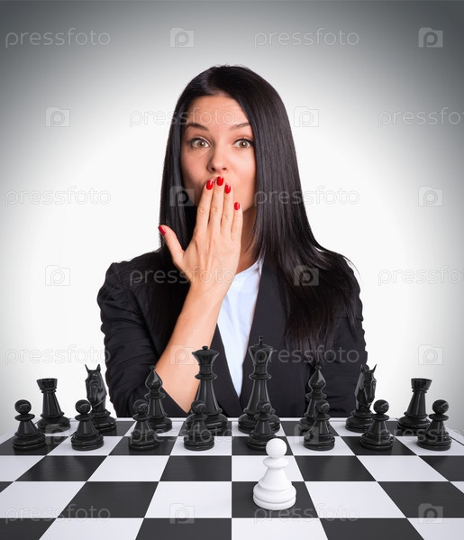 Удивленная бизнес-леди над шахматной доской