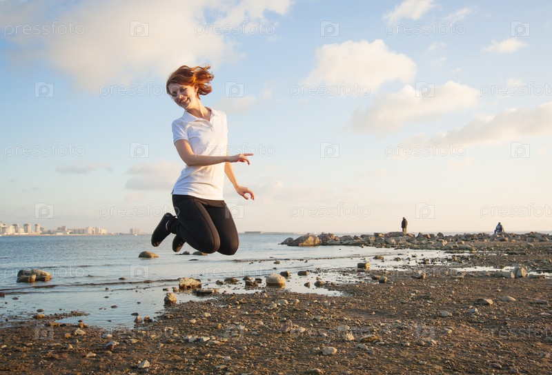Молодая женщина прыгает на берегу озера