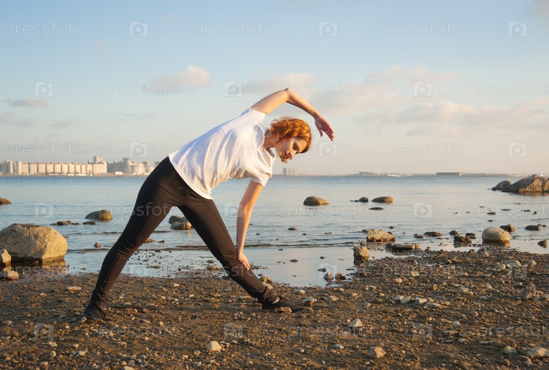 Женщина занимается йогой на свежем воздухе
