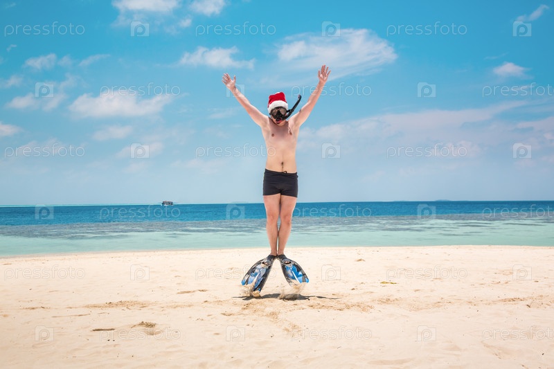 Мужчина в колпаке Санты на тропическом пляже