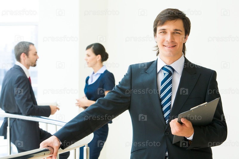 Портрет привлекательного мужчины в костюме, смотрящего на камеру с общающимися соратниками на заднем плане