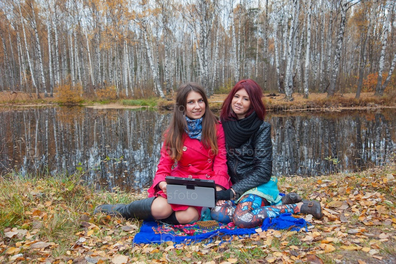 Девушки с планшетом в лесу