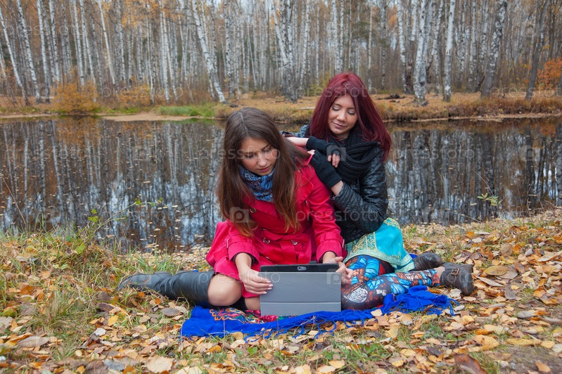 Девушки с планшетом в лесу